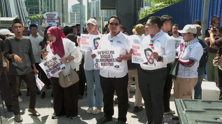 احتشد عشرات المتظاهرين أمام السفارة الأميركية في كوالالمبور اليوم الجمعة للاحتجاج على اقتراح تعيين الكاتب والخبير السياسي نيك آدامز سفيرا للولايات المتحدة لدى ماليزيا.