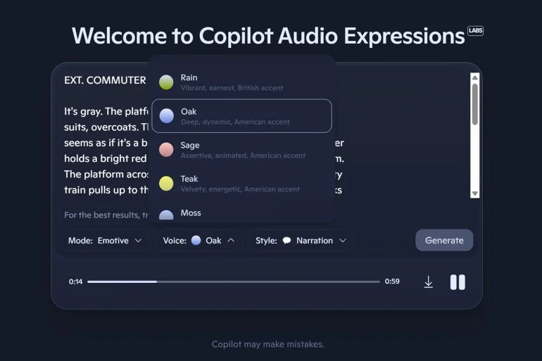 أداة "تعابير الصوت" في "كوبايلوت" (Copilot Audio Expression) من مايكروسوفت، التي أُطلقت ضمن منصة "كوبايلوت لابس" (Copilot Labs)، تمثل خطوة نوعية نحو صوت رقمي أكثر قربًا للصوت البشري وأكثر قدرة على التعبير.