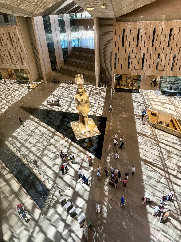 وُضع تمثال الملك رمسيس الثاني الضخم الذي يزن 83 طنا ويبلغ ارتفاعه 11 مترا، عند مدخل ردهة المتحف الفسيحة.