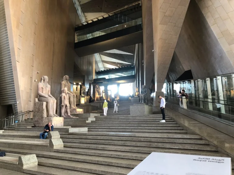بُني المتحف المصري الكبير حول درج ضخم مُزيَّن بتماثيل ومقابر ضخمة، يؤدي إلى واجهة بانورامية واسعة تُطل على الأهرامات.