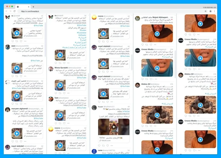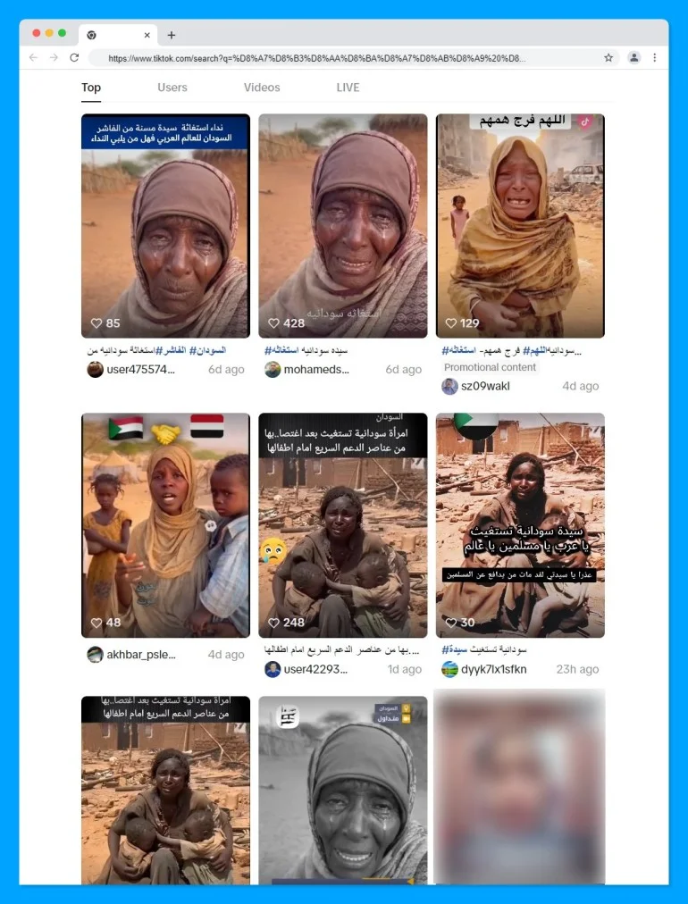 ولم تكن منصة "تيك توك" بعيدة عن المشهد، فعند استخدام الكلمات المفتاحية نفسها أظهرت نتائج البحث عشرات الفيديوهات التي تزعم أنها التُقطت حديثا من داخل السودان، وتوثق معاناة المدنيين في مدينة الفاشر.