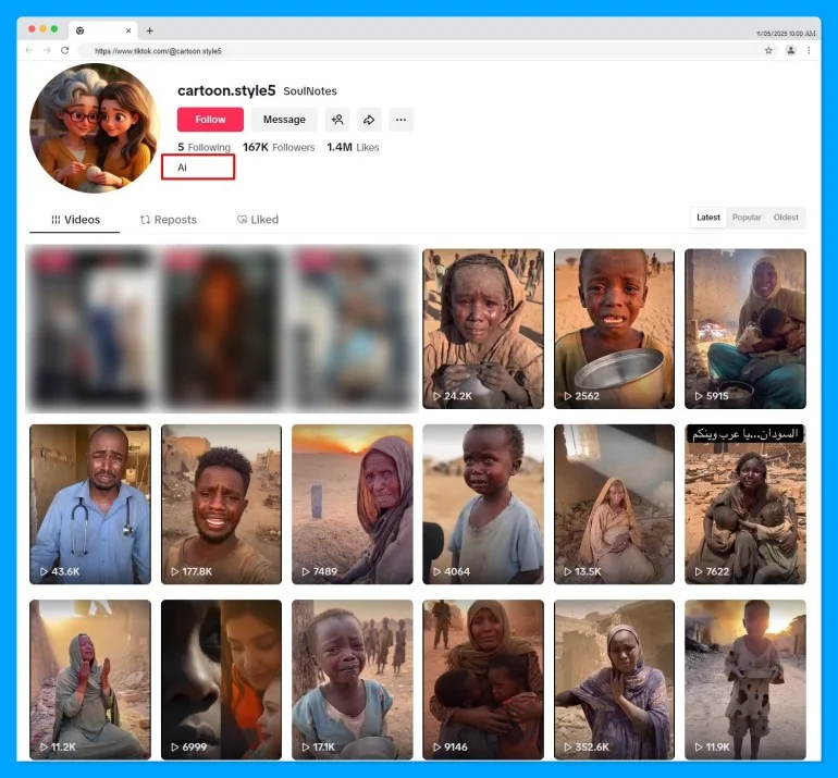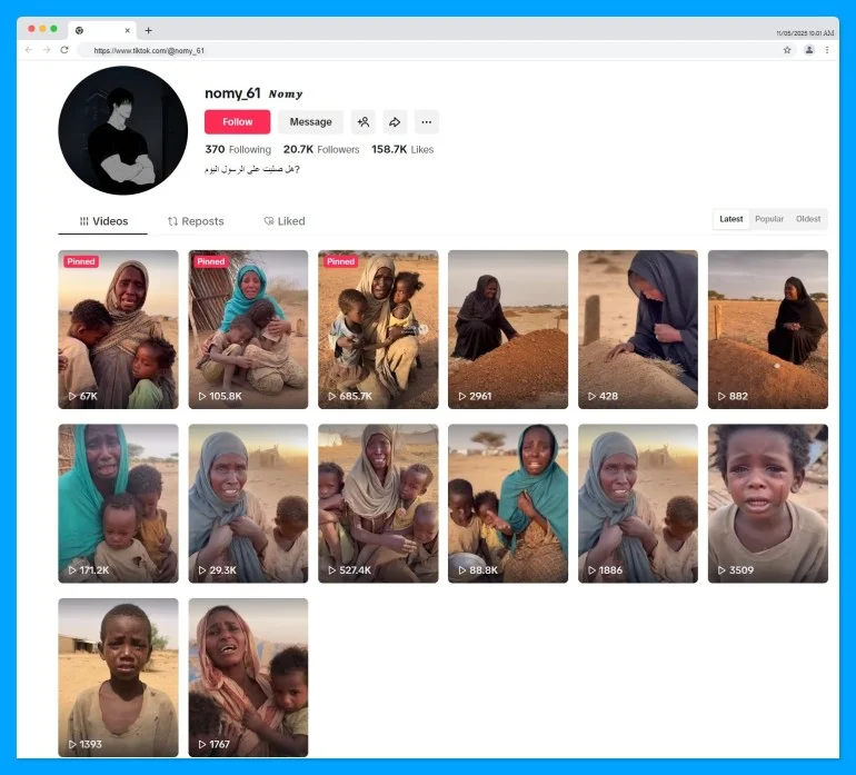 وتوصل فريقنا إلى المصادر الأصلية لهذه المقاطع، فتبين أن مجموعة من الحسابات على منصة "تيك توك" خصصت محتواها خلال الأسابيع الأخيرة لإنتاج مقاطع مولدة بالكامل بالذكاء الاصطناعي، تتناول الأوضاع الإنسانية في السودان، دون أن تُظهر أشخاصا حقيقيين كما زعم ناشروها.
