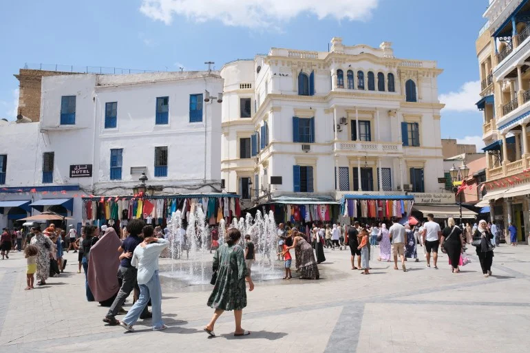 ووسط ساحة النصر المطلة على الباب، تضفي المياه المنبعثة من النافورة أجواء نشطة أمام المحلات التجارية. ويقول عبد القادر سويسي، بائع إكسسوارات تقليدية: "المنطقة تنبض بالحياة، لكن الأزمة الاقتصادية تلقي بظلالها على التجارة. ننتظر قدوم السياح والرحلات البحرية لإنقاذ الوضع".
