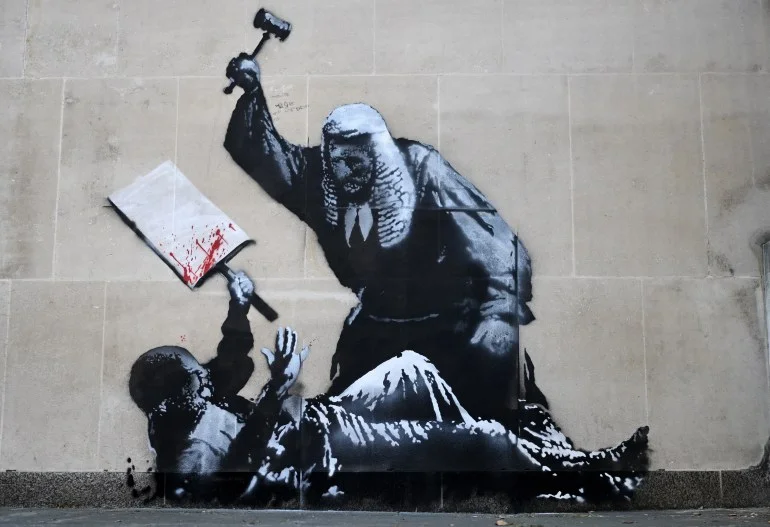 وفي وقت سابق من هذا العام، حاولت السلطات إزالة لوحة لبانكسي على جدار محكمة في لندن تصوّر قاضيا يضرب متظاهرا، وكان يُعتقد أنها تشير إلى حملة القمع التي تشنها البلاد ضد مجموعة الاحتجاج "العمل من أجل فلسطين" (Palestine Action).