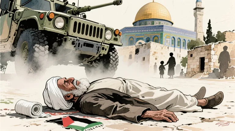 راقب عمامته تتدحرج بعيدا. انفجرت نافورة الدم من صدره مرة واحدة. جهز عقله ليتذكر اللحظة التي سبقت ذلك. كان واقفا، متصلبا في مكانه، يشبك ذراعيه مع الرجال ليحمي المسجد، مثلما فعل في كل محاولة اقتحام سابقة للمسجد. لم يثنه تقدمه في العمر هذه المرة، ولا القوة البدنية التي تركته. راقب اقتراب الجنود، علا صراخ الأطفال والنساء خلفه. هرب الشبان وتفرقوا عندما اندفعت المركبة العسكرية في اتجاههم. تذكر.