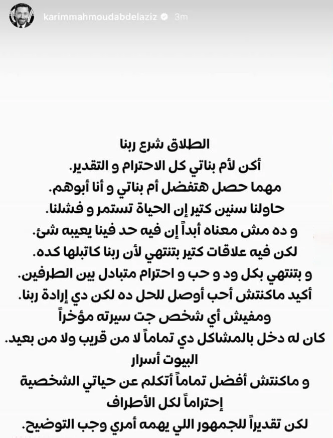 ونشر عب خاصية الـ “ستوري” في حسابه الرسمي، “الطلاق شرع ربنا، وأكنّ لأم بناتي كل الاحترام والتقدير. مهما حصل، هتفضل أم بناتي وأنا أبوهم. حاولنا كتير إن الحياة تستمر وفشلنا، وده مش معناه إن حد فينا يعيبه شيء. مكنتش حابب أوصل للحل ده، ومفيش حد سيرته جت أخيرا كان له دخل بالمشاكل من بعيد ولا من قريب”.