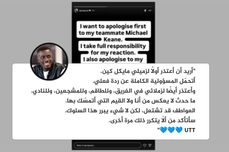 “أعتذر لزميلي مايكل كين، وأتحمل المسؤولية الكاملة عما بدر مني من رد فعل. كذلك أعتذر لجميع زملائي في الفريق، والطاقم الفني، وجماهير النادي. ما حدث لا يعكس شخصيتي ولا القيم التي أؤمن بها. صحيح أن العواطف قد تكون جياشة أحيانا، لكن لا شيء يبرر هذا السلوك، وأتعهد بألا أكرر ما حدث”.