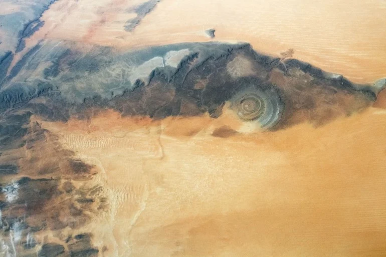 التقطت مهمة كوبرنيكوس سنتينل-2 مشهدا لأكثر الظواهر الجيولوجية إدهاشا في الصحراء الكبرى، وهي بنية الريشات في إقليم آدرار شمال موريتانيا. من الفضاء تبدو كأنها “عين” هائلة تحدّق للأعلى، من بحر من الرمال الذهبية، ولذلك اشتهرت باسم عين الصحراء أو عين أفريقيا.