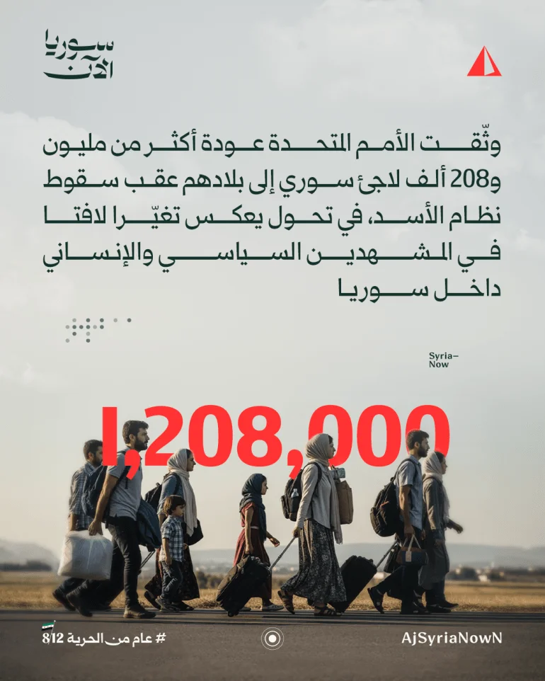وثقت الأمم المتحدة عودة أكثر من مليون و208 آلاف لاجئ سوري إلى بلادهم بعد سقوط نظام بشار الأسد، في تحول يعكس تغيرا لافتا في المشهدين السياسي والإنساني داخل سوريا.