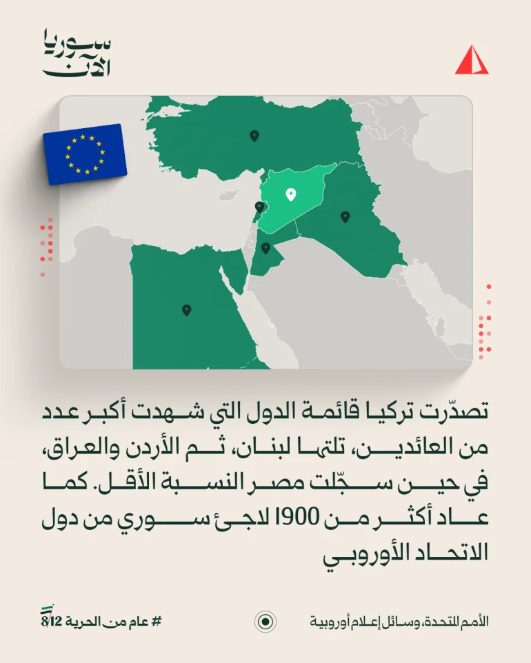 وتصدرت تركيا قائمة الدول التي شهدت أكبر عدد من السوريين العائدين، تلتها لبنان، ثم الأردن والعراق، وقد سجلت مصر النسبة الأقل. كما عاد نحو 1900 سوري من دول الاتحاد الأوروبي.