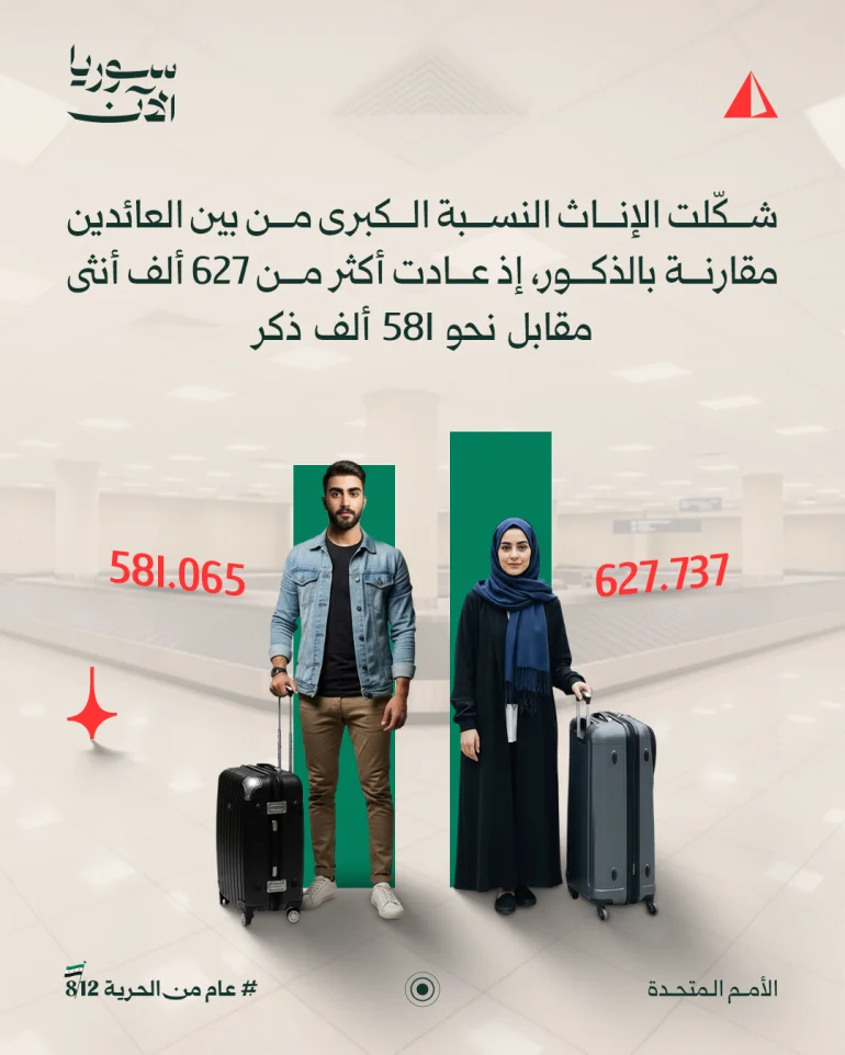 وتشكل الإناث النسبة الكبرى بين العائدين، حيث بلغ عددهن أكثر من 627 ألف امرأة مقابل نحو 581 ألف رجل.