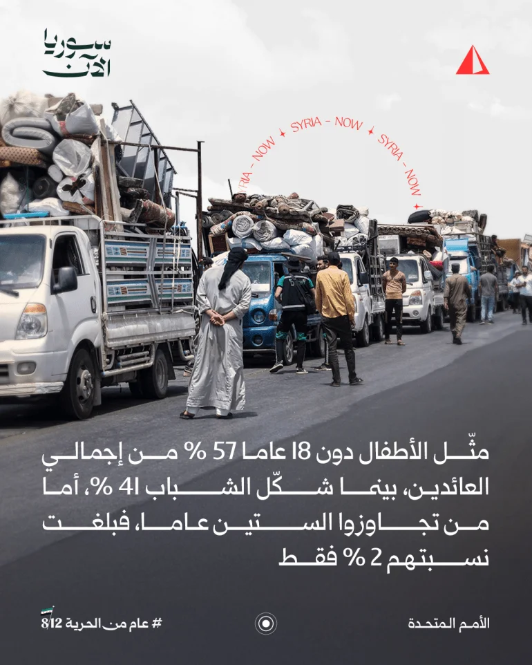 عودة السوريين إلى بلادهم بعد سقوط نظام بشار الأسد تجاوزت المليون و208 آلاف لاجئ، وفقًا للأمم المتحدة. تصدرت تركيا قائمة الدول التي شهدت أكبر عدد من العائدين، تلتها لبنان والأردن والعراق. الإناث يشكلن النسبة الأكبر بين العائدين، والأطفال دون 18 عامًا يمثلون 57% من إجمالي العائدين. دمشق وحلب وإدلب كانت الأكثر استقبالًا للعائدين. على الرغم من العودة، لا يزال الكثيرون يواجهون تحديات بسبب تدمير المنازل، ولا يزال الملايين ينتظرون العودة.