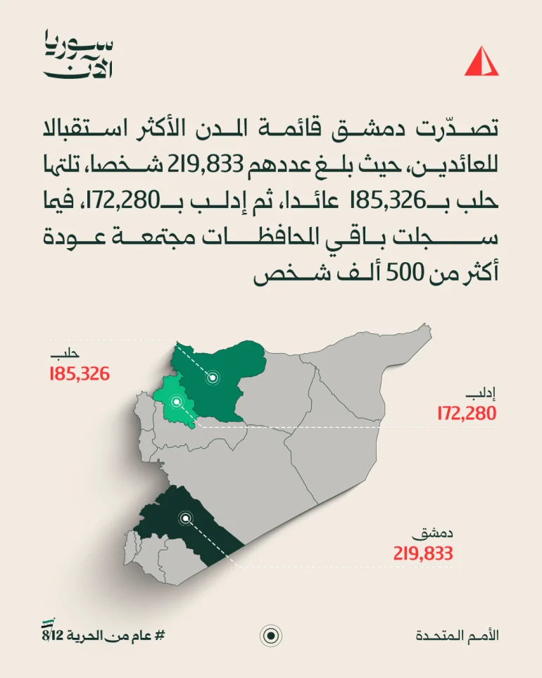 وعلى صعيد المدن، تصدرت دمشق قائمة الأكثر استقبالا للعائدين بعدد 219 ألفا و833 شخصا، تلتها حلب (185 ألفا و326) ثم إدلب (172 ألفا و280) وقد سجلت باقي المحافظات مجتمعة عودة أكثر من نصف مليون شخص.