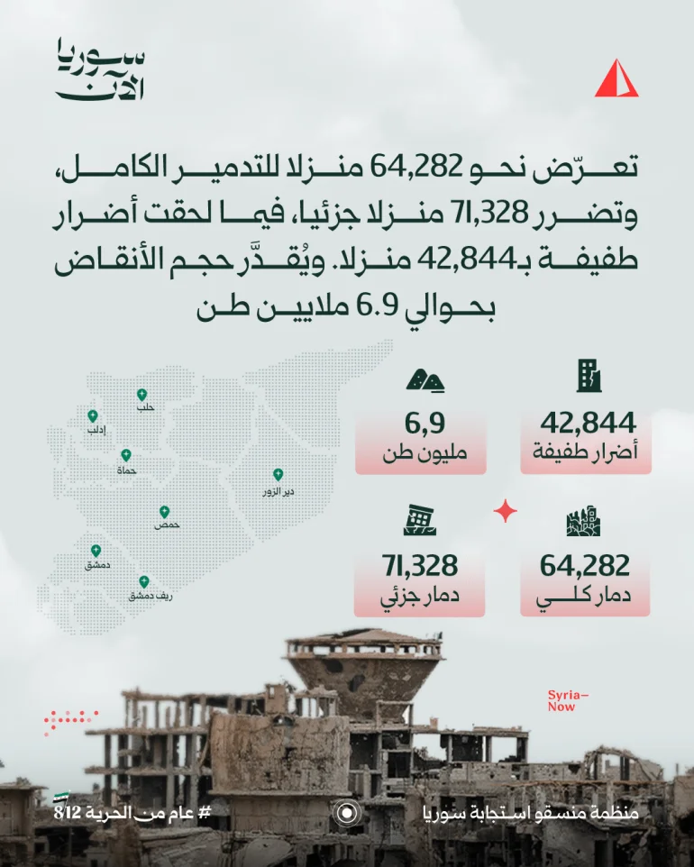 ورغم عودة مئات آلاف السوريين إلى وطنهم، فإن عددا قليلا منهم تمكن من العودة إلى منازلهم. فقد تعرض نحو 64 ألفا و282 منزلا للتدمير الكامل، وتضرر 71 ألفا و328 منزلا جزئيا، ولحقت أضرار طفيفة بـ42 ألفا و844 منزلا، ويُقدّر حجم الأنقاض بحوالي 6.9 ملايين طن.