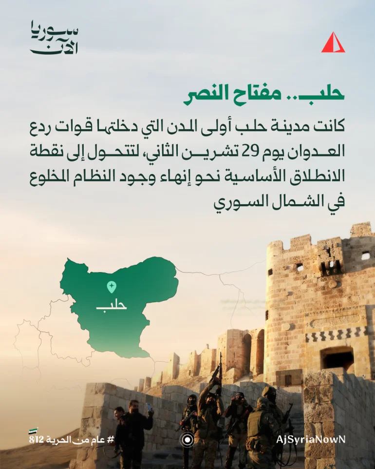 قبل عام، وتحديدا يوم 29 نوفمبر/تشرين الثاني، دخلت قوات ردع العدوان مدينة حلب، معلنة نهاية سيطرة نظام الرئيس السوري المخلوع بشار الأسد على واحدة من كبرى المدن السورية وأكثرها رمزية. ومنذ ذلك اليوم، تحولت حلب إلى مؤشر أساسي يُقاس به مسار ما بعد السقوط، ومختبر عملي لإعادة بناء المدن التي أنهكتها الحرب والتهجير والانقسام.