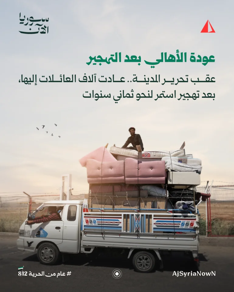 ومن أبرز التحولات التي شهدتها المدينة خلال هذا العام، بدء موجة عودة الأهالي بعد تهجير استمر لنحو 8 سنوات. وقدرت مصادر محلية أعداد العائدين بعشرات الآلاف، معظمهم من سكان الأحياء الشرقية سابقا.