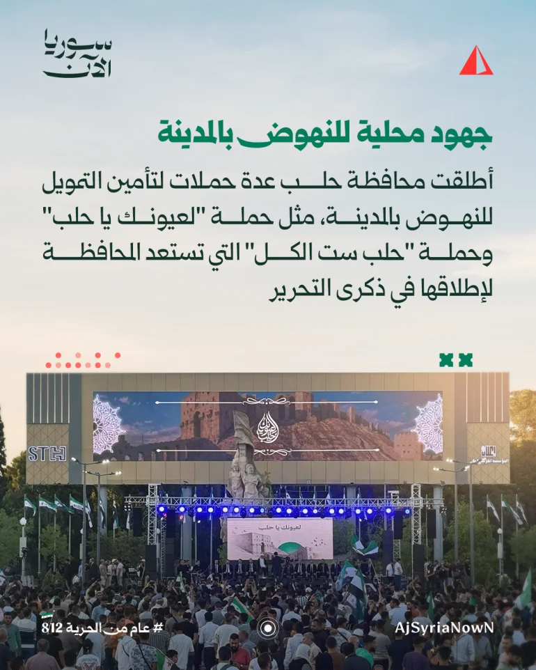 وإلى جانب الجهود الحكومية، شهدت حلب إطلاق حملات تطوعية وتمويل محلي لمشاريع إعادة التأهيل، من بينها حملة “لعيونك يا حلب”، وحملة “حلب ست الكل” التي تستعد السلطات لإطلاقها بالتزامن مع ذكرى التحرير.