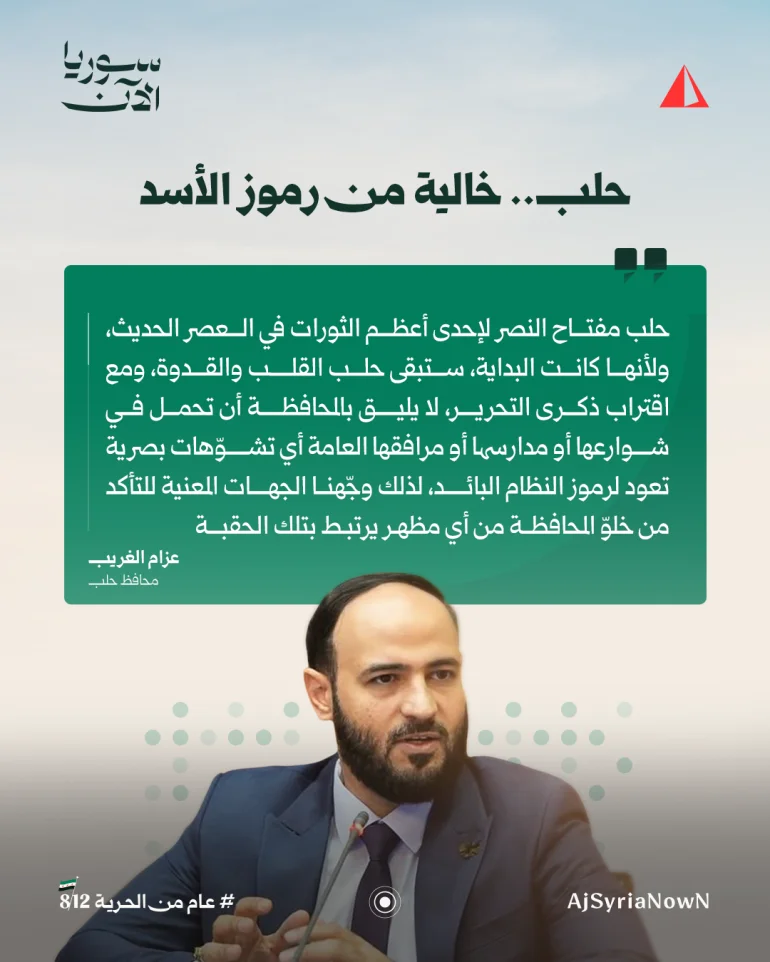 وضمن خطة أوسع لإعادة تشكيل الهوية البصرية للمدينة، وجه محافظ حلب عزام الغريب بحذف جميع الرموز والشعارات والصور المرتبطة بمرحلة النظام السابق من المدارس والدوائر الرسمية والطرق العامة.